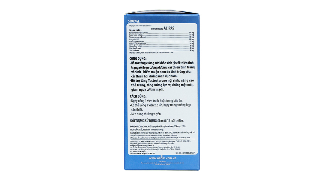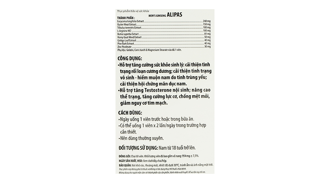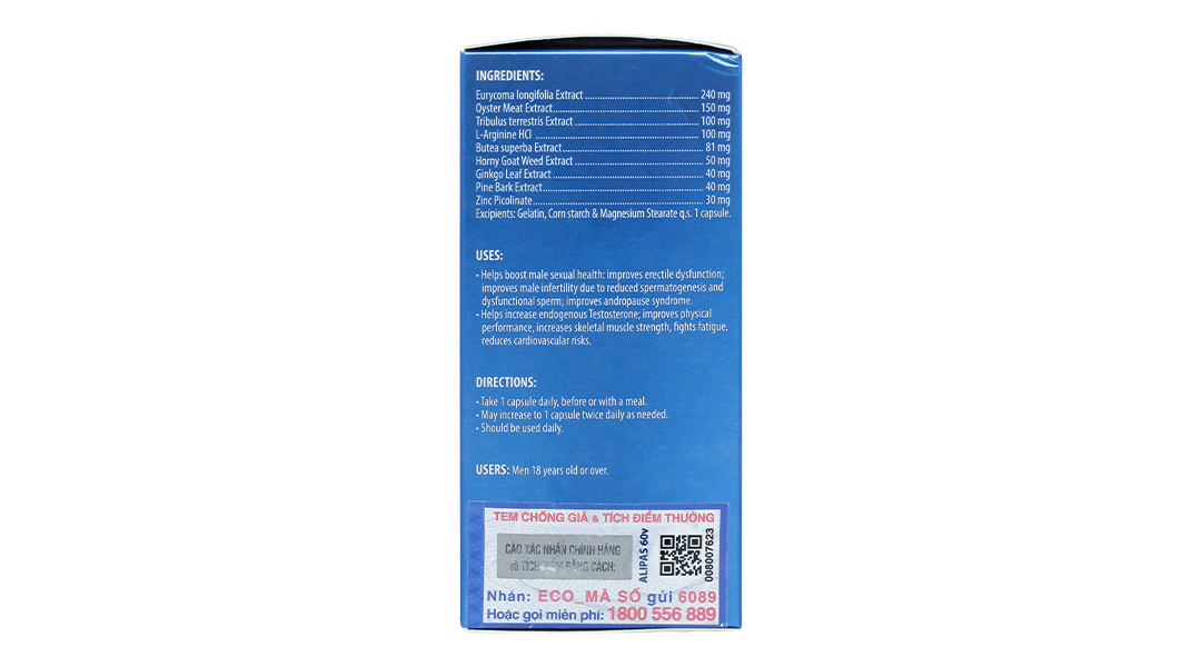 Hoạt chấtGinkgo Leaf Extract, L-Arginine HCl, Horny Goat Weed Extract, Zinc Picolinate, Tribulus terrestris Extract