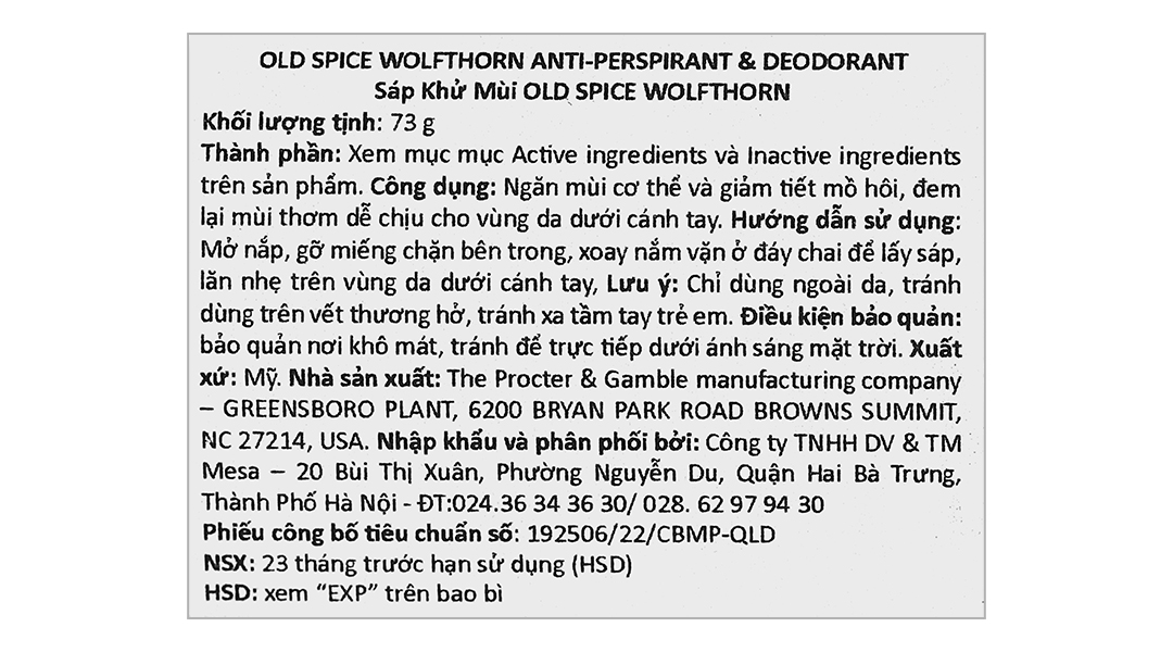Sáp khử mùi Old Spice Wolfthorn ngăn mùi cơ thể, giảm tiết mồ hôi chai 73g
