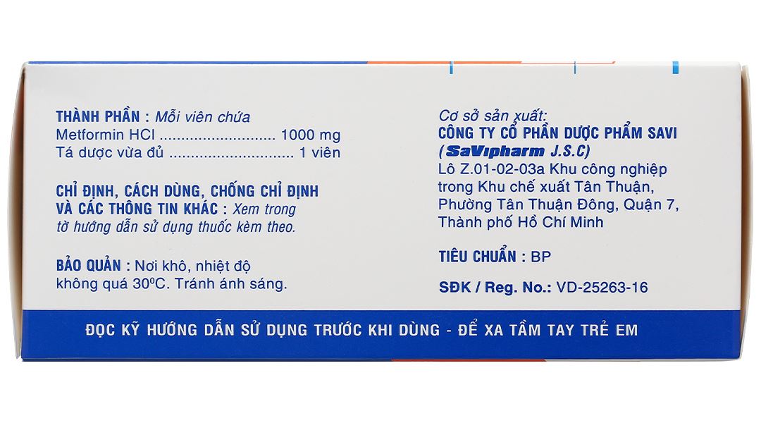 - Thành phần dược chất: Metformin hydroclorid: 1000mg.
