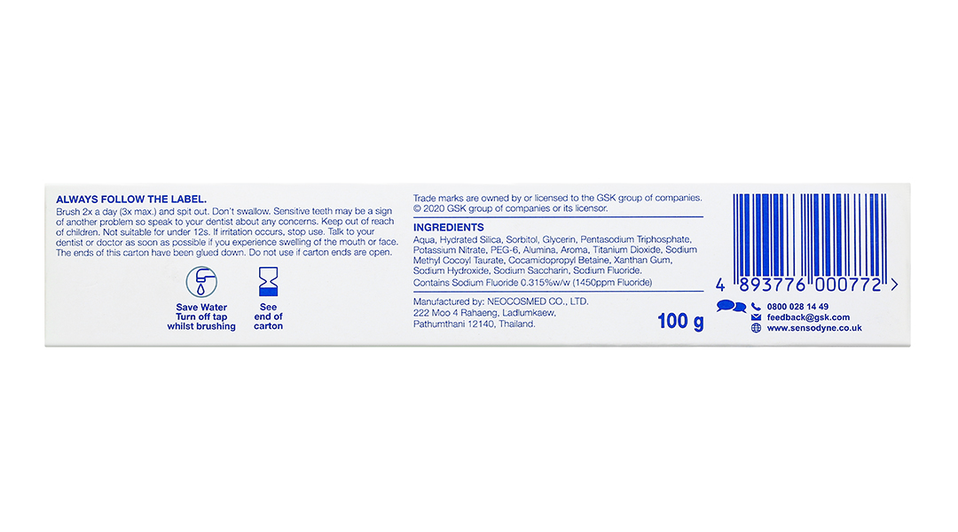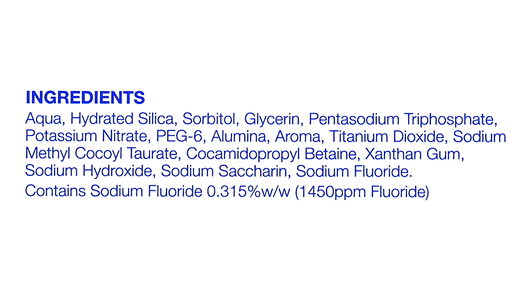 - Aqua, Hydrated Silica, Sorbitol, Glycerin, Pentasodium Triphosphate, Potassium Nitrate, PEG-6, Alumina, Aroma, Titanium Dioxide, Sodium Methyl Cocoyl Taurate, Cocamidopropyl Betaine, Xanthan Gum, Sodium Hydroxide, Sodium Saccharin, Sodium Fluoride.