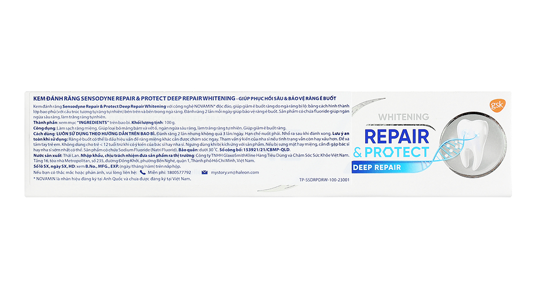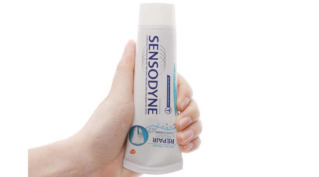 - Kem đánh răng Sensodyne Repair & Protect Deep Repair Whitening với công nghệ tiên tiến Novamin giúp phục hồi sâu cho răng ê buốt bằng cách hình thành lớp bảo vệ vững chắc với cấu trúc tương tự men răng bao phủ vùng răng nhạy cảm.