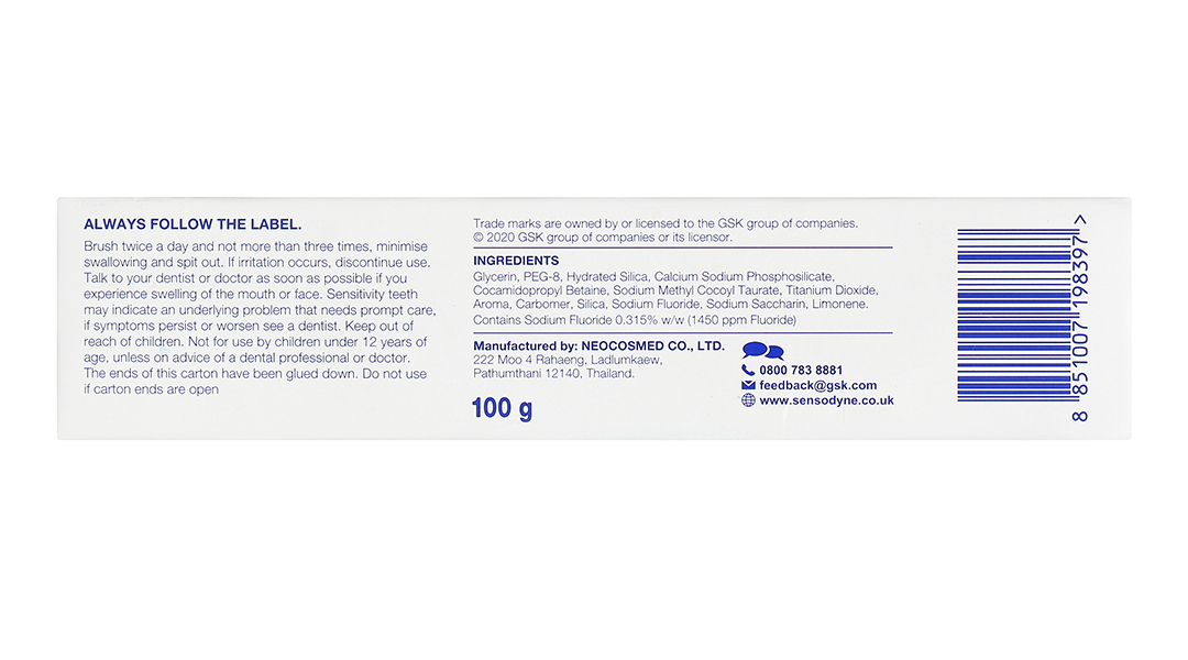 Glycerin, PEG-8, Hydrated Silica, Calcium Sodium Phosphosilicate, Cocamidopropyl Betaine, Sodium Methyl Cocoyl Taurate, Titanium Dioxide, Aroma, Carbomer, Silica, Sodium Fluoride, Sodium Saccharin, Limonene. Contains Sodium Fluoride 0.315% w/w (1450 ppm Fluoride).