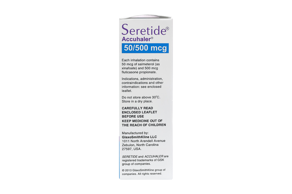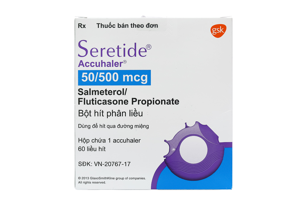 SERETIDE ACCUHALER 50/500mcg: Dụng cụ bằng nhựa dẻo (plastic) dạng khuôn chứa một vỉ nhôm với 60 túi phồng (blister) được phân bố đều đặn trên vỉ, mỗi túi phồng chứa 72,5 microgram salmeterol xinafoate (tương đương 50 microgram salmeterol) và 500 microgram fluticasone propionate.