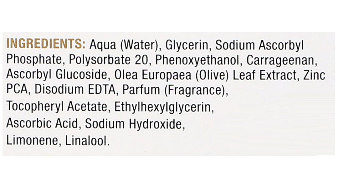 Aqua (Water), Glycerin, Sodium Ascorbyl Phosphate, Polysorbate 20, Phenoxyethanol, Carrageenan, Ascorbyl Glucoside, Olea Europaea (Olive) Leaf Extract, Zinc PCA, Disodium EDTA, Parfum (Fragrance), Tocopheryl Acetate, Ethylhexylglycerin, Ascorbic Acid, Sodium Hydroxide, Limonene, Linalool.
