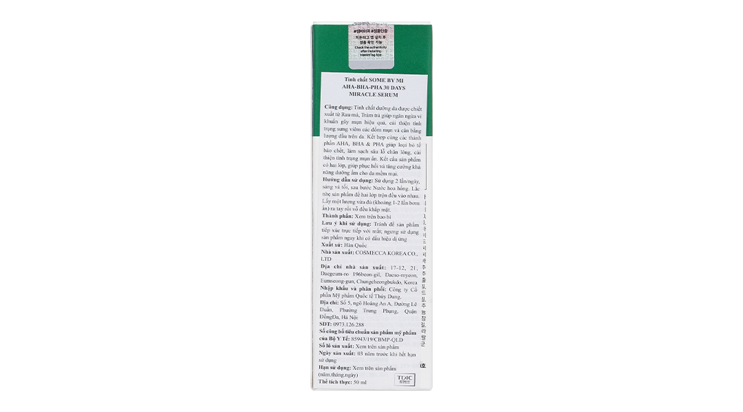 Thành phần chínhChiết xuất Rau má, Tràm trà, AHA-BHA-PHA