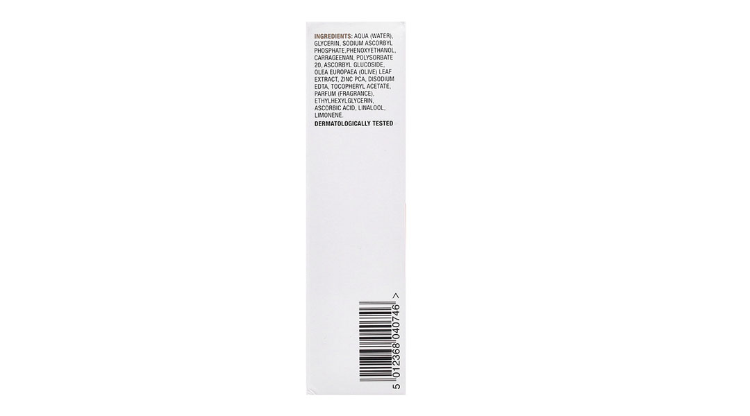 Thành phần chínhAqua (water), glycerin, sodium ascorbyl phosphate, phenoxyethanol, carrageenan, polysorbate 20, ascorbyl glucoside, Olea europaea (olive) leaf extract, zinc PCA, disodium EDTA, tocopheryl acetate, parfum (fragrance) ethylhexylglycerin, ascorbic acid, acid linalool, limonene.