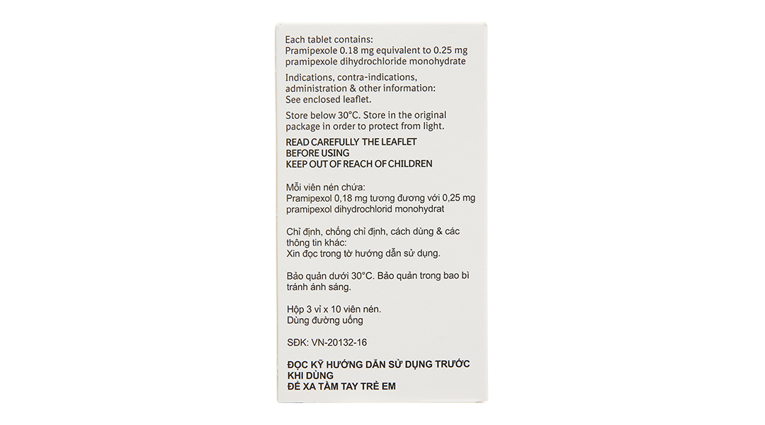 - Hoạt chất: Pramipexol dihydrochlorid monohydrat 0.25mg (tương đương 0.18mg pramipexol dạng bazơ) hoặc 1mg (tương đương 0.7mg pramipexol dạng bazơ). Có thể bẻ đôi viên nén.