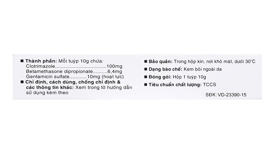 - Hoạt chất: Gentamicin sulfate 10mg (hoạt lực), Betamethasone dipropionate 6.4mg, Clotrimazole 100mg.