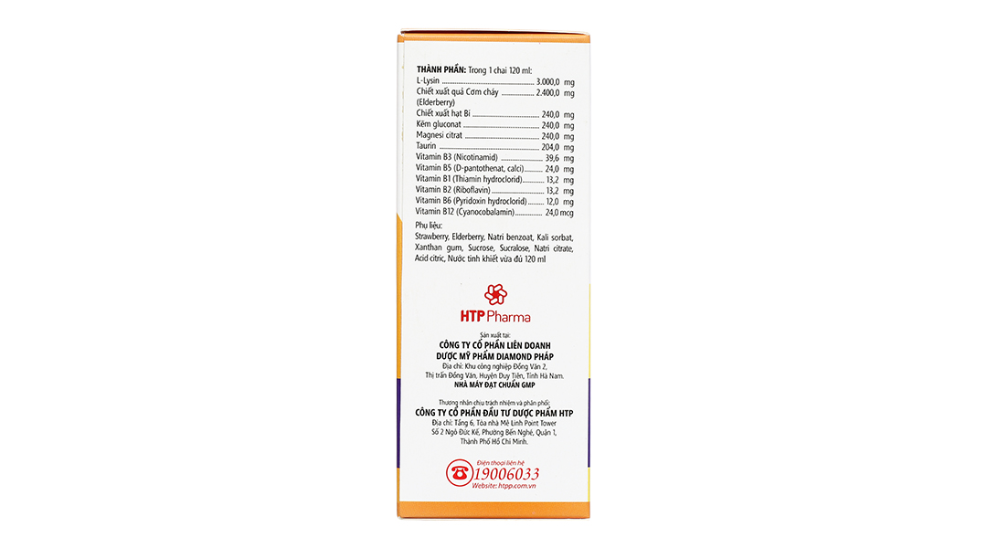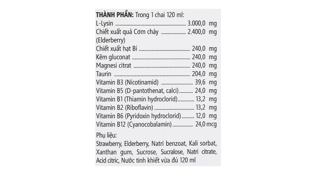 Phụ liệu: Strawberry, Elderberry, Natri benzoat, Kali sorbat, Xanthan gum, Sucrose, Sucralose, Natri citrate, Acid citric, Nước tinh khiết vừa đủ 120ml.