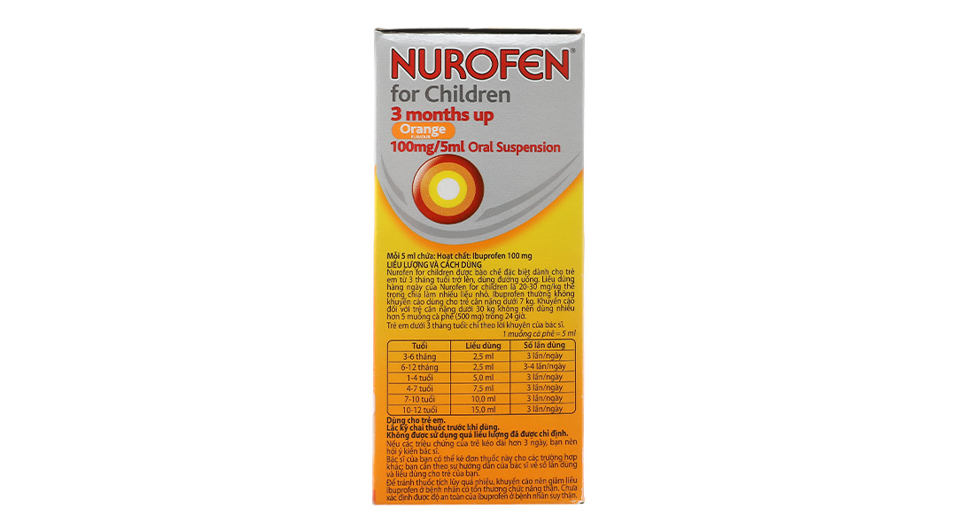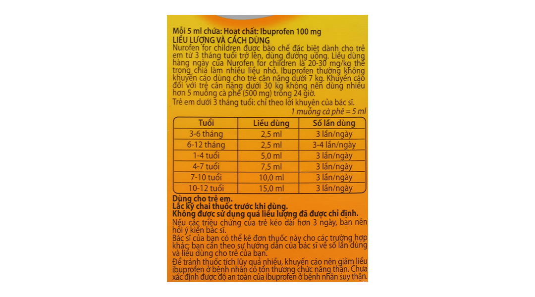 Nurofen for children được bào chế đặc biệt dành cho trẻ em từ 3 tháng tuổi trở lên, dùng đường uống. Liều dùng hàng ngày của Nurofen for children là 20 – 30 mg/kg thể trọng chia làm nhiều liều nhỏ. Ibuprofen thường không khuyến cáo dùng cho trẻ em cân nặng dưới 7kg. Khuyến cáo đối với trẻ em cân nặng dưới 30kg không nên dùng nhiều hơn 5 muỗng cà phê (500mg) trong 24 giờ. Trẻ em dưới 3 tháng tuổi: chỉ theo lời khuyên của bác sĩ.