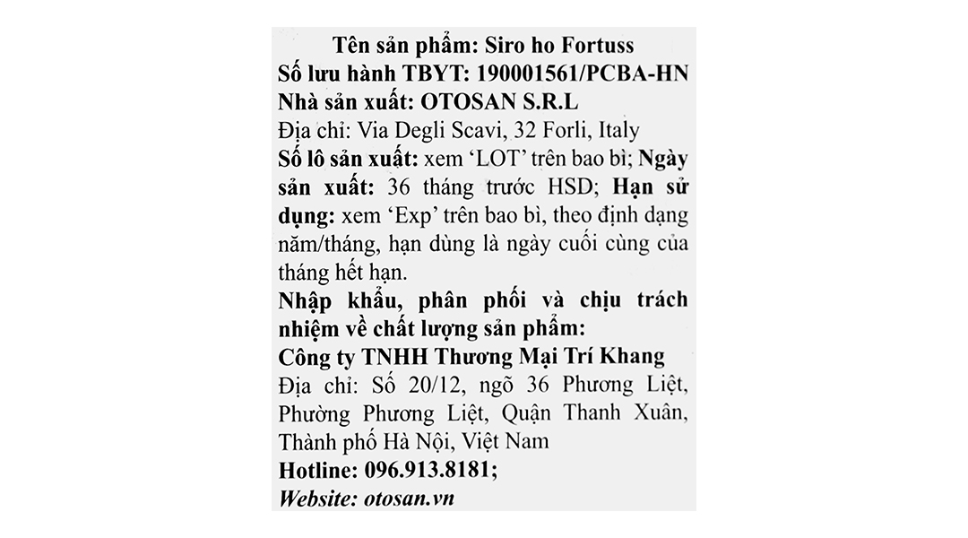 Siro ho ForTuss Otosan làm dịu cổ họng, giảm các triệu chứng ho chai 180g