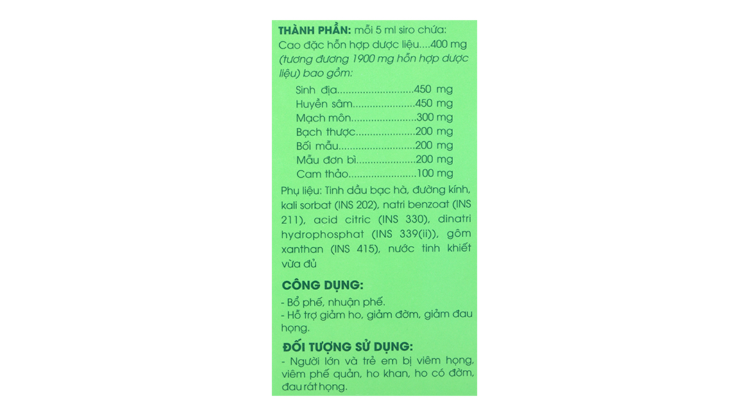 Đối tượng sử dụngNgười lớn và trẻ em từ 3 tuổi trở lên bị viêm họng, viêm phế quản, ho khan, ho có đờm,...