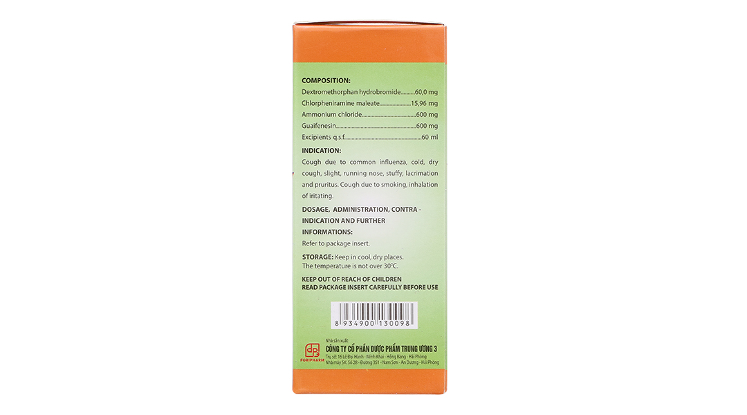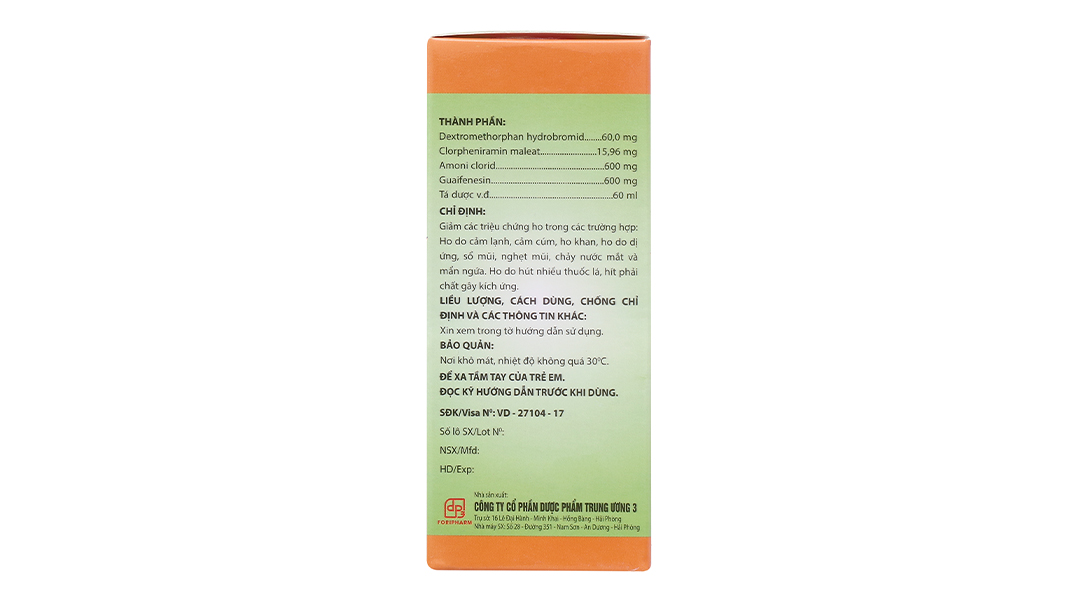 Hoạt chấtDextromethorphan hydrobromid, Guaifenesin, Clorpheniramin maleat, Amoni Clorid