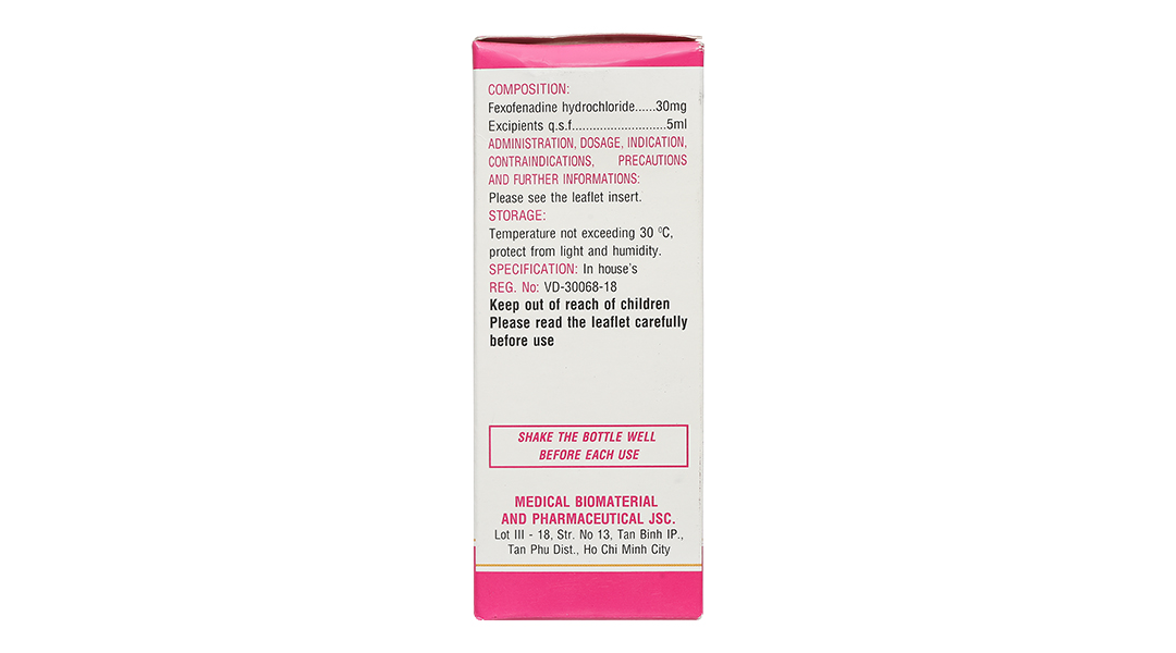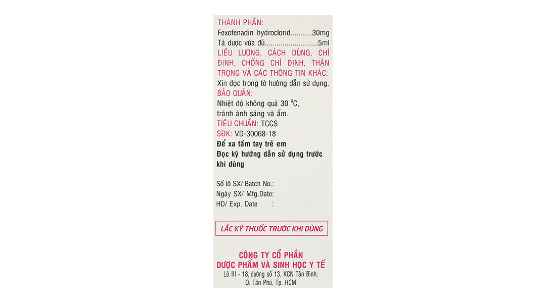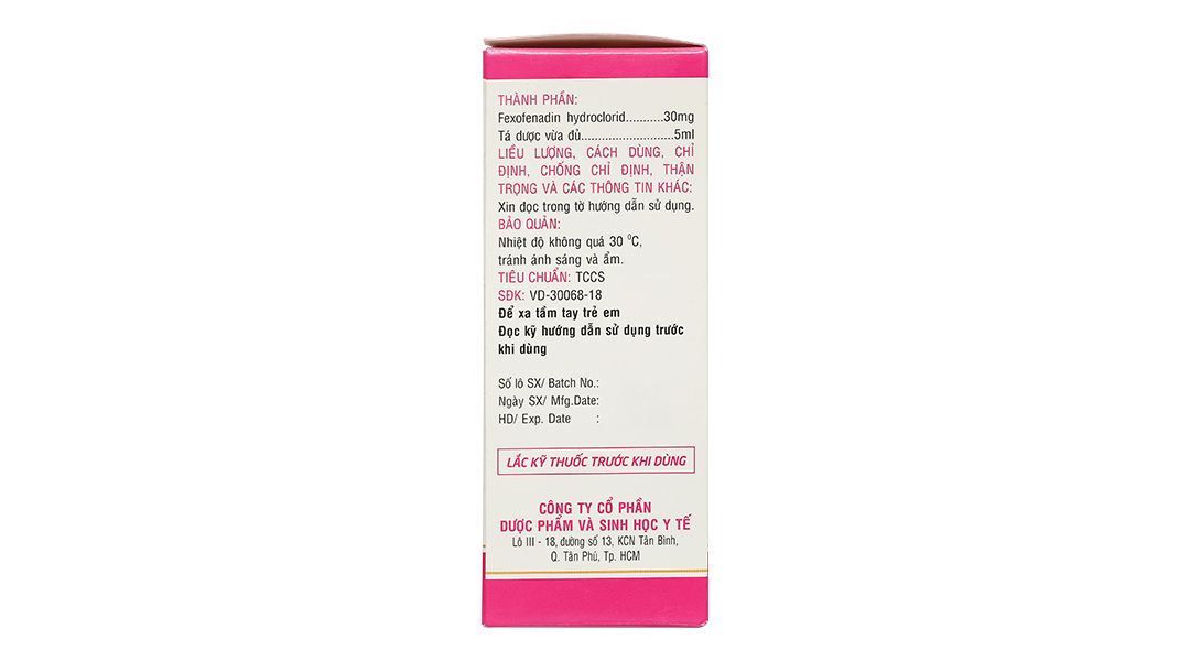 - Thành phần hoạt chất: Fexofenadin hydroclorid 30 mg.