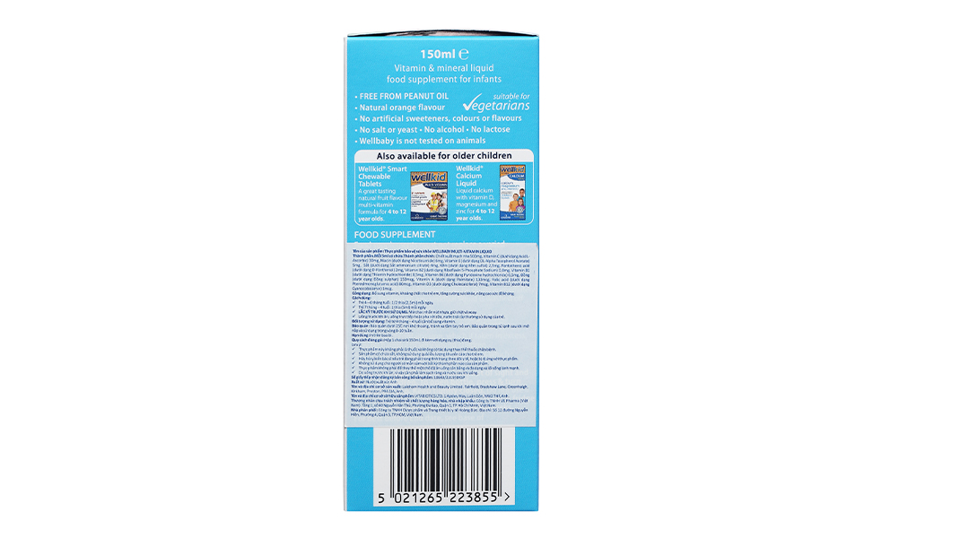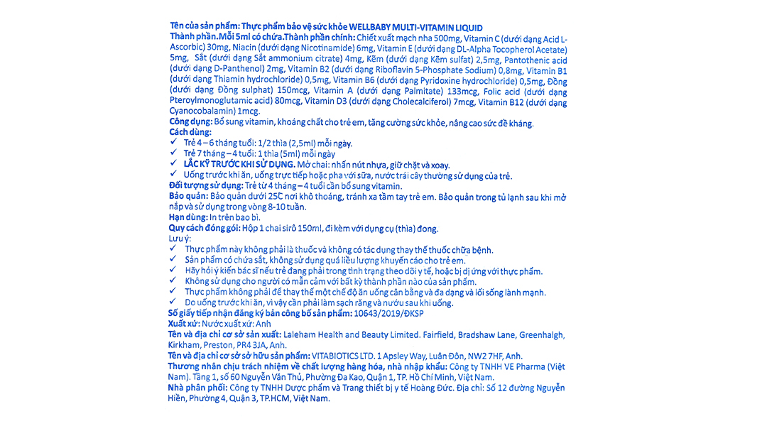 Wellbaby Multi-vitamin Liquid từ Vitabiotics là một giải pháp dinh dưỡng được nghiên cứu kỹ lưỡng để đáp ứng nhu cầu phát triển nhanh chóng của trẻ từ 4 tháng đến 4 tuổi. Với hơn 50 năm kinh nghiệm trong lĩnh vực nghiên cứu và phát triển các công thức bổ sung vi chất dinh dưỡng, Vitabiotics cam kết mang đến sản phẩm an toàn, hiệu quả, và được sản xuất dựa trên các nghiên cứu khoa học tiên tiến nhất. Đây là sự lựa chọn lý tưởng cho các bậc phụ huynh mong muốn bổ sung vitamin và khoáng chất thiết yếu để hỗ trợ sự phát triển toàn diện của con yêu.