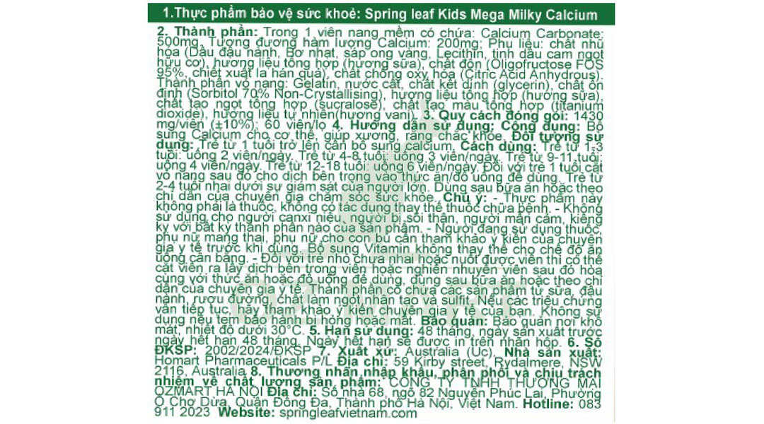 - Mỗi viên SpringLeaf Kids Mega Milky Calcium cung cấp 500 mg Canxi cacbonat, tương đương với 200 mg canxi nguyên tố, đáp ứng hầu hết lượng canxi cần thiết hàng ngày cho trẻ (theo khuyến nghị của Úc). Canxi là dưỡng chất thiết yếu giúp xây dựng và duy trì hệ xương và răng khỏe mạnh, đồng thời hỗ trợ chức năng thích hợp của tim, cơ và dây thần kinh.