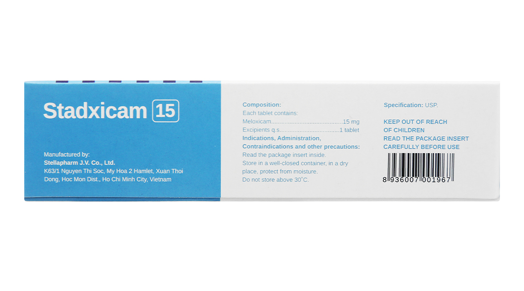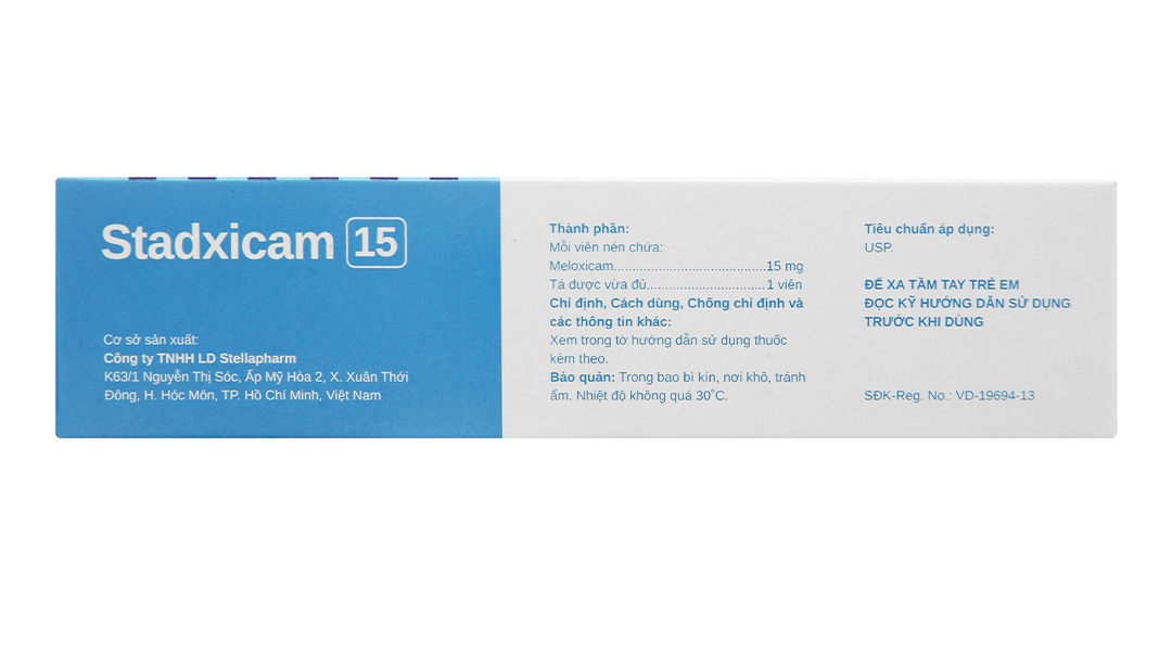 – Thận trọng khi sử dụng– Nguy cơ huyết khối tim mạch: + Các thuốc chống viêm không steroid (NSAIDs), không phải aspirin, dùng đường toàn thân có thể làm tăng nguy cơ xuất hiện biến cố huyết khối tim mạch, bao gồm cả nhồi máu cơ tim và đột quỵ, có thể dẫn đến tử vong. Nguy cơ này có thể xuất hiện sớm trong vài tuần đầu dùng thuốc và có thể tăng lên theo thời gian dùng thuốc. Nguy cơ huyết khối tim mạch được ghi nhận chủ yếu ở liều cao. + Bác sĩ cần đánh giá định kỳ sự xuất hiện của các biến cố tim mạch, ngay cả khi bệnh nhân không có các triệu chứng tim mạch trước đó. Bệnh nhân cần được cảnh báo về các triệu chứng của biến cố tim mạch nghiêm trọng và cần thăm khám bác sĩ ngay khi xuất hiện các triệu chứng này. + Để giảm thiểu nguy cơ xuất hiện biến cố bất lợi, cần sử dụng stadxicam 15 ở liều hàng ngày thấp nhất có hiệu quả trong thời gian ngắn nhất có thể. – Ảnh hưởng trên đường tiêu hóa: Nguy cơ của những ảnh hưởng trầm trọng trên đường tiêu hóa (như chảy máu, loét, thủng), có thể xảy ra bất cứ thời gian nào có hoặc không có những dấu hiệu và triệu chứng cảnh báo. Những phương pháp trị liệu kết hợp có thể làm tăng nguy cơ bao gồm tiền sử chảy máu hoặc loét đường tiêu hóa, điều trị lâu dài với thuốc NSAID, điều trị với thuốc chống đông hoặc với các thuốc corticosteroid đường uống, hút thuốc, nghiện rượu, tình trạng sức khỏe chung kém hoặc ở những người cao tuổi (nguy cơ cao hơn về biến chứng đường tiêu hóa gây tử vong). – Tăng huyết áp: Sử dụng các thuốc NSAID, bao gồm meloxicam có thể gây ra tăng huyết áp khởi phát hoặc làm trầm trọng thêm bệnh tăng huyết áp sẵn có, trường hợp này làm tăng tỷ lệ mắc bệnh tim mạch. – Ảnh hưởng trên thận: Hoại tử nhú thận hoặc thay đổi tủy thận có thể xảy ra khi dùng lâu dài các thuốc NSAID. – Phản ứng quá mẫn: Phản ứng quá mẫn bao gồm phản ứng phản vệ có thể xảy ra ở những bệnh nhân không có sự mẫn cảm với meloxicam trước đó. Những phản ứng da nghiêm trọng (như viêm da tróc mảng, hội chứng Stevens-Johnson, độc hoại tử biểu bì) có thể xảy ra ở những bệnh nhân dùng meloxicam. – Ảnh hưởng huyết học: Bệnh thiếu máu đã được báo cáo, chủ yếu xảy ra ở những bệnh nhân dùng meloxicam lâu dài (thời gian khoảng 6 tháng). – Stadxicam 15 có chứa lactose. Không nên dùng thuốc này cho bệnh nhân có các vấn đề về di truyền hiếm gặp không dung nạp galactose, thiếu hụt enzym lactase toàn phần hay kém hấp thu glucose-galactose. – Thai kỳ và cho con búPhụ nữ có thai Tránh dùng thuốc trong 3 tháng cuối thai kỳ vì có khả năng gây đóng sớm ống động mạch của bào thai. Khả năng chậm chuyển dạ khi dùng thuốc vào cuối thai kỳ. Phụ nữ cho con bú Meloxicam bài tiết qua sữa ở chuột, nên ngưng cho con bú hoặc ngưng dùng thuốc vì khả năng nguy hiểm trên trẻ bú mẹ. – Tương tác thuốc– Các thuốc NSAID và acid acetylsalicylic ≥ 3 g/ngày: Kết hợp với các thuốc kháng viêm không steroid khác, bao gồm acid acetylsalicylic với liều kháng viêm (liều đơn ≥ 1 g hay tổng liều hàng ngày ≥ 3g) không được chỉ định. – Corticosteroid: Nên thận trọng khi sử dụng chung với corticosteroid vì tăng nguy cơ chảy máu hay loét dạ dày ruột. . – Thuốc chống đông hay heparin chỉ định cho người cao tuổi hay tại liều điều trị: Làm tăng nguy cơ chảy máu, thông qua ức chế chức năng tiểu cầu và phá hủy niêm mạc dạ dày ruột. – Thuốc lợi tiểu, ức chế enzym chuyển và đối kháng angiotensin II: Các thuốc NSAID có thể làm giảm tác dụng của thuốc lợi tiểu và các thuốc chống tăng huyết áp khác. – Các thuốc chống tăng huyết áp khác (như thuốc chẹn kênh beta): Như những thuốc trên, giảm tác dụng hạ huyết áp của các thuốc chẹn kênh beta (do ức chế prostaglandin với tác dụng giãn mạch) có thể xảy ra. – Cyclosporin: Độc tính thận của cyclosporin có thể tăng lên khi sử dụng NSAID thông qua tác động trung gian prostaglandin ở thận. – Lithi: Thuốc NSAID được báo cáo là làm tăng nồng độ của lithi trong máu (thông qua làm giảm bài tiết lithi ở thận), điều này có thể dẫn đến ngưỡng gây độc. – Methotrexat: Thuốc NSAID có thể làm giảm sự bài tiết methotrexat ở ống thận do làm tăng nồng độ methotrexat trong huyết tương. – Cholestyramin: Cholestyramin làm tăng sự đào thải meloxicam bằng cách ngăn chặn chu trình gan – ruột, vì thế độ thanh thải của meloxicam tăng lên 50% và thời gian bán thải giảm còn 13 ± 3 giờ. Tương kỵ của thuốc Do không có các nghiên cứu về tính tương kỵ của thuốc, không trộn lẫn thuốc này với các thuốc khác. |