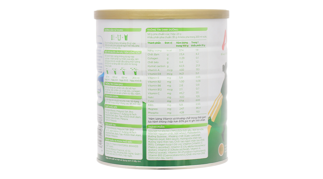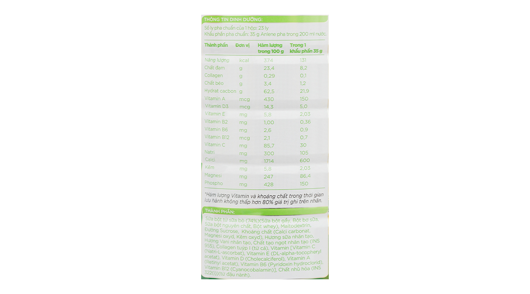 Thành phần: Sừa bột từ sữa bò (74%) (Sữa bột gầy, bột bơ sữa, sữa bột nguyên chất, bột whey), Maltodextrin, đường Sucrose, khoáng chất (Calci Carbonat, Magnesi Oxyd, Kẽm Oxyd), hương sữa nhân tạo, hương vani nhân tạo, chất tạo ngọt nhân tạo (INS 955), Collagen tuýp I (từ cá), Vitamin [Vitamin C (Natri-L-ascorbat), Vitamin E (DL-alpha-tocopheryl acetat), vitamin D (Cholecalciferol), Vitamin A (retinyl acetat), Vitamin B6 (Pyridoxin hydroclorid), Vitamin B12 (Cyanocobalamin)], chất nhũ hóa (INS 322 (i)) (từ đậu nành).