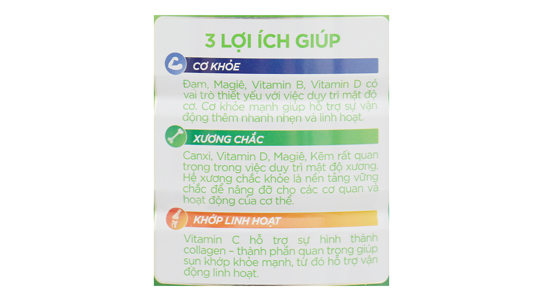 - Xương chắc: Canxi, Vitamin D, Magie, kẽm rất quan trọng trong việc duy trì mật độ xương. Hệ xương chắc khỏe là nền tảng vững chắc để nâng đỡ cho các cơ quan và hoạt động của cơ thể.