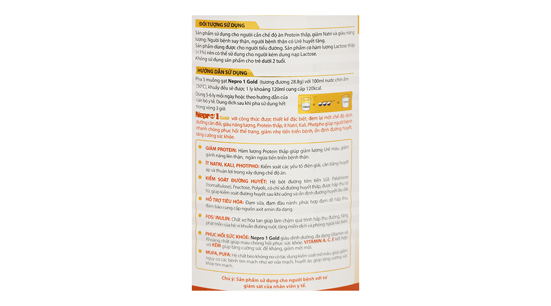 Pha 3 muỗng gạt Nepro 1 Gold (tương đương 28,8g) với 100ml nước chín ấm (50oC), khuấy đều sẽ được 1 ly khoảng 120ml cung cấp 120kcal.