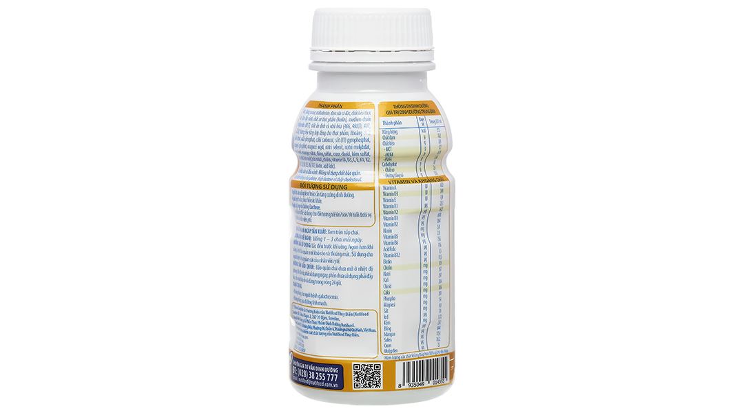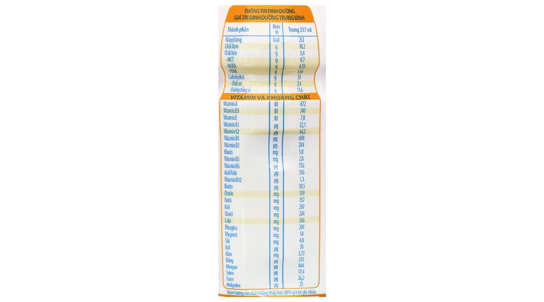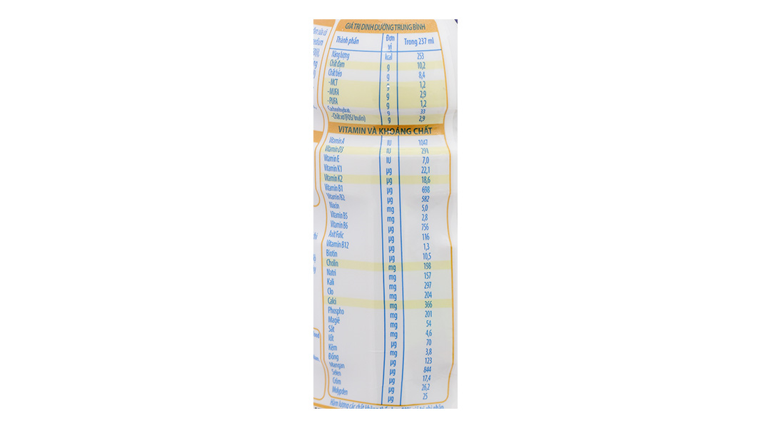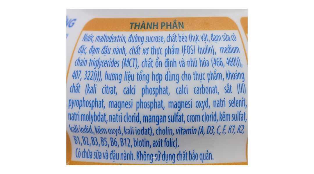 Nước, đường sucrose, maltodextrin, đạm sữa cô đặc, chất béo thực vật, đạm đậu nành, chất xơ thực phẩm (Inulin), medium chain triglycerides (MCT), chất ổn định và nhũ hóa (466, 460(i), 407, 321(i)), hươg iệu tổng hợp dùng cho thực phẩm, khoáng chất (kali citrat, calci phosphat, calci carbonat, sắt (III) pyrophosphat, magnesi phosphat, magnesi oxyd, natri selenit, natri molybdat, nari clorid, mangan sulfat, đồng sulfat, crom clorid, kẽm sulfai, kali iodid, kẽm oxyd, kali iodat), cholin, vitamin (A, D3, C, E, K1, K2, B1, B2, B3, B5, B6, B12, biotin, acid folic).