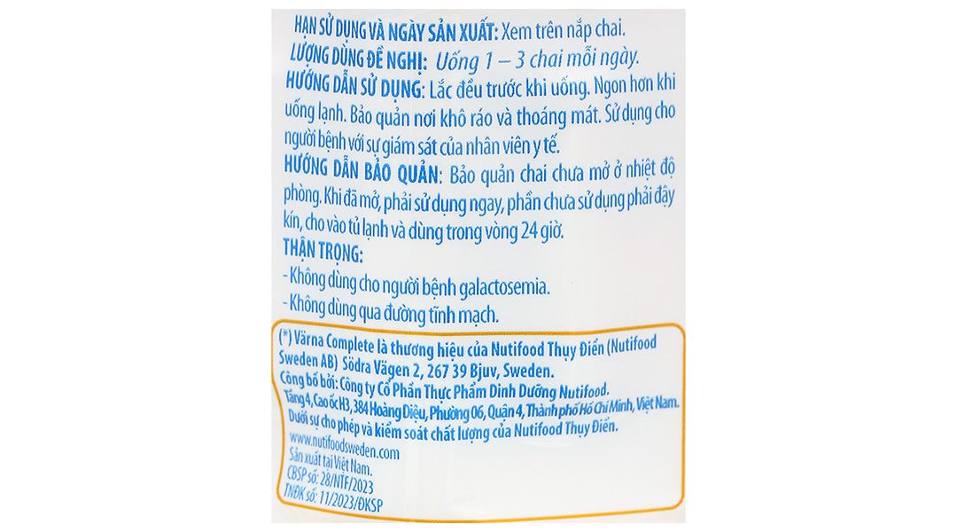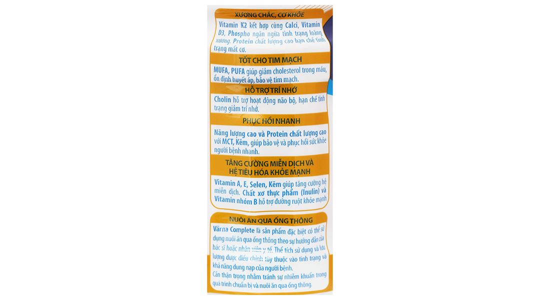Värna Complete là sản phẩm đặc biệt có thể sử dụng nuôi qua ống thông theo sự hướng dẫn của bác sĩ hoặc nhân viên y tế. Thể tích sử dụng và liều lượng được điều chỉnh tùy thuộc vào tình trạng và khả năng dung nạp của người bệnh.