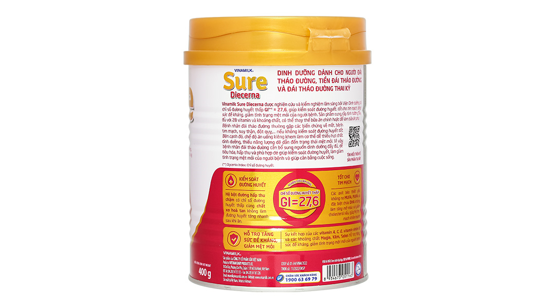 Sữa bột Vinamilk Sure Diecerna với công thức được nghiên cứu và kiểm nghiệm lâm sàng bởi Viện Dinh Dưỡng Quốc Gia về khả năng kiểm soát đường huyết nhờ đường hấp thu chậm Palatinose và chất xơ hòa tan. Sản phẩm sữa bột pha chuẩn có chỉ số đường huyết thấp, không làm đường huyết tăng nhanh sau khi ăn, phù hợp với nhu cầu năng lượng ở những bệnh nhân đái tháo đường.