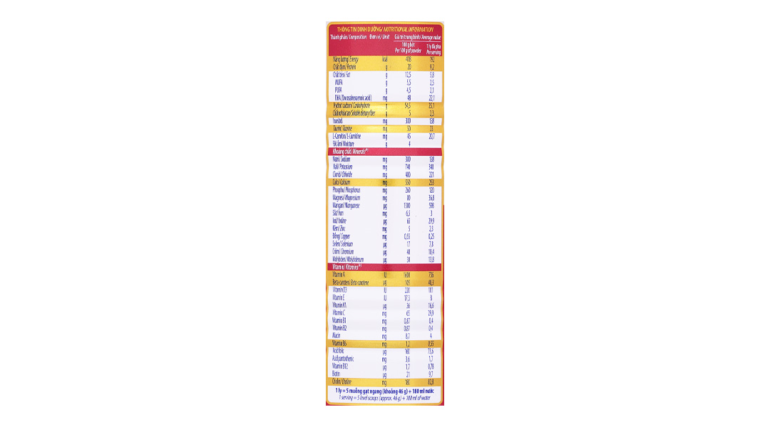 Thành phần | Trong 100g bột | Trong 1 ly đã pha (180ml) | Thành phần | Trong 100g bột | Trong 1 ly đã pha (180ml) |