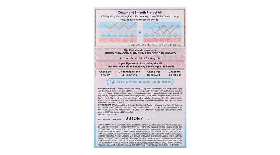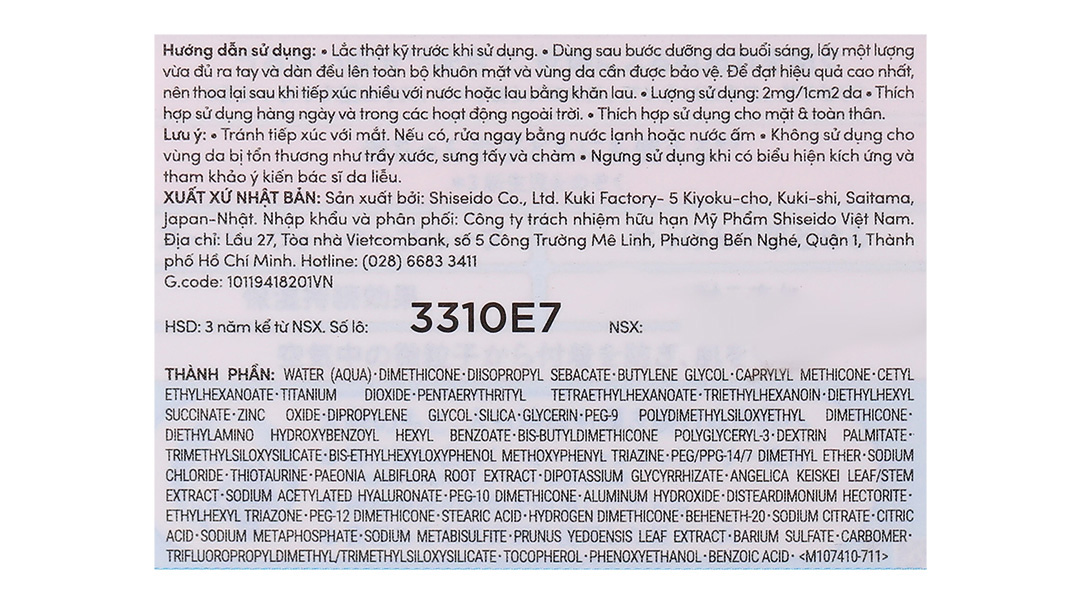 Thành phần chínhWater (Aqua), Dimethicone, Diisopropyl Sebacate, Butylene Glycol, Caprylyl Methicone, Cetyl Ethylhexanoate, Titanium Dioxide, Pentaerythrityl Tetraethylhexanoate, Triethylhexanoin, Diethylhexyl Succinate, Zinc Oxide, Dipropylene Glycol, Silica, Glycerin, Peg-9 Polydimethylsiloxyethyl Dimethicone, Diethylamino Hydroxybenzoyl Hexyl Benzoate, Bis-Butyldimethicone Polyglyceryl-3, Dextrin Palmitate, Trimethylsiloxysilicate, Bis-Ethylhexyloxyphenol Methoxyphenyl Triazine, Peg/Ppg-14/7 Dimethyl Ether, Sodium Chloride, Thiotaurine, Paeonia Albiflora Root Extract, Dipotassium Glycyrrhizate, Angelica Keiskei Leaf/Stem Extract, Sodium Acetylated Hyaluronate,  Peg-10 Dimethicone, Aluminum Hydroxide, Disteardimonium Hectorite, Ethylhexyl Triazone, Peg-12 Dimethicone, Stearic Acid, Hydrogen Dimethicone, Beheneth-20, Sodium Citrate, Citric Acid, Sodium Metaphosphate, Sodium Metabisulfite, Prunus Yedoensis Leaf Extract, Barium Sulfate, Carbomer, Trifluoropropylmethyl/Trimethylsiloxysilicate,  Tocopherol, Phenoxyethanol, Benzoic Acid, (M107410-711).