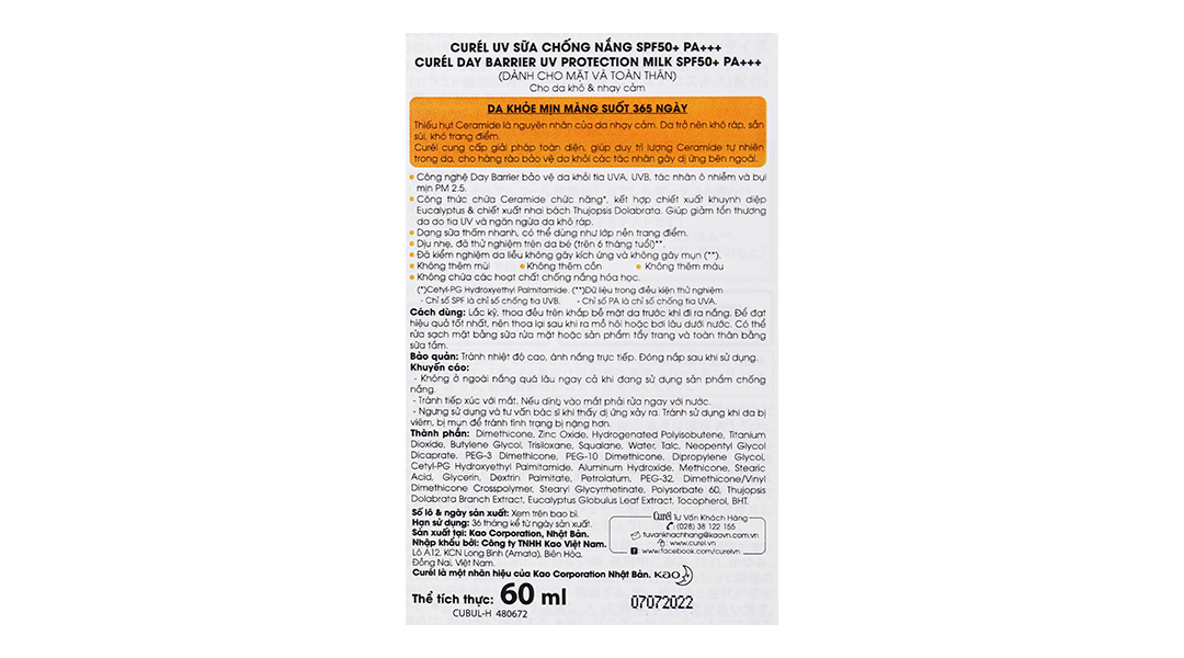 - Sản phẩm sữa chống nắng của nhà Curél với công nghệ Day Barrier bảo vệ da khỏi tia UVA, UVB, tác nhân ô nhiễm và bụi mịn PM2.5. Đồng thời, công thức chứa ceramide chức năng, kết hợp chiết xuất khuynh diệp Eucalyptus & chiết xuất nhai bách Thujopsis Dolabrata. Giúp giảm tổn thương da do tia UV và ngăn ngừa da khô ráp.