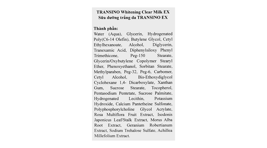 Water (Aqua), Glycerin, Hydrogenated Poly (C6-14 Olefin), Butylene Glycol, Cetyl Ethylhexanoate, Alcohol, Diglycerin, Tranexamic Acid, Diphenylsiloxy Phenyl Trimethicone, Peg-150 Stearate, Glycerin/Oxybutylene Copolymer Stearyl Ether, Phenoxyethanol, Sorbitan Stearate, Methylparaben, Peg-32, Peg-6, Carbomer, Cetyl Alcohol, Bis-Ethoxydiglycol Cyclohexane 1,4- Dicarboxylate, Xanthan Gum, Sucrose Stearate, Tocopherol, Pentasodium Pentetate, Sucrose Palmitate, Hydrogenated Lecithin, Potassium Hydroxide, Calcium Pantetheine Sulfonate, Polyphosphorylcholine Glycol Acrylate, Rosa Multiflora Fruit Extract, Isodonis Japonicus Leaf/Stalk Extract, Morus Alba Root Extract, Geranium Robertianum Extract, Sodium Trehalose Sulfate, Achillea Millefolium Extract.