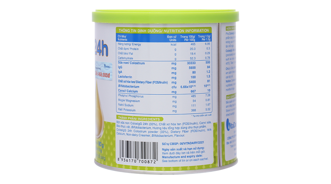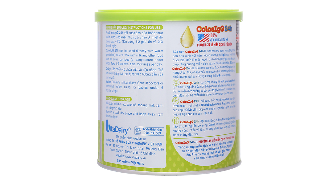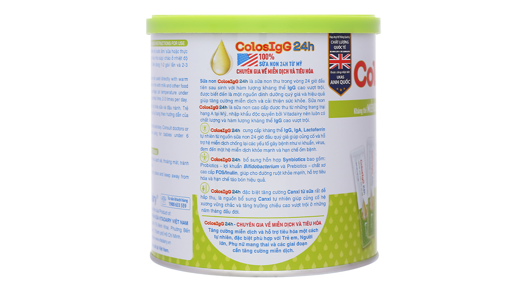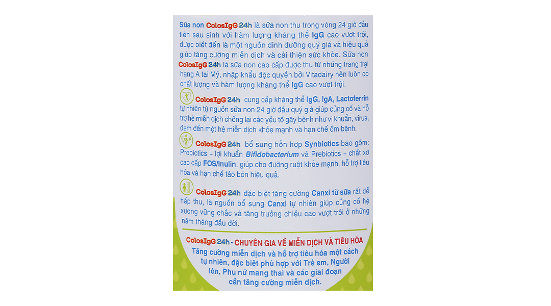 VitaDairy ColosIgG 24h với công thức chứa sữa non 24h nhập khẩu 100% từ Mỹ, bổ sung lợi khuẩn và Canxi từ sữa, giúp tăng cường sức đề kháng, củng cố hệ miễn dịch khỏe mạnh và hỗ trợ tiêu hóa một cách tự nhiên.