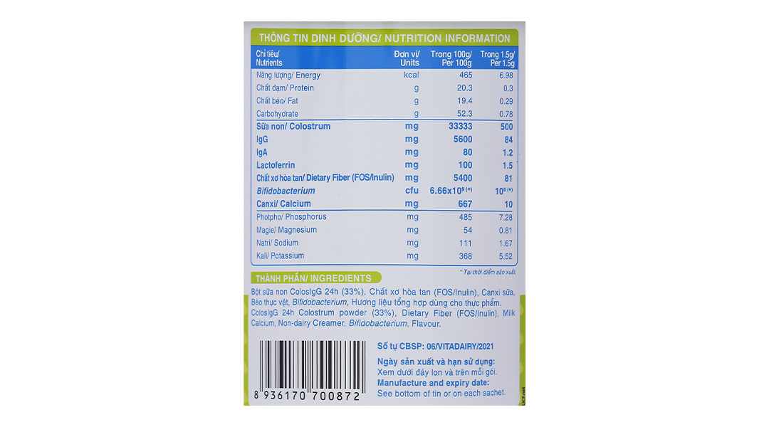 Bột sữa non ColosIgG 24h (33%), Chất xơ hòa tan (FOS/Inulin), Canxi sữa, Béo thực vật, Bifidobacterium, Hương liệu tổng hợp dùng cho thực phẩm.