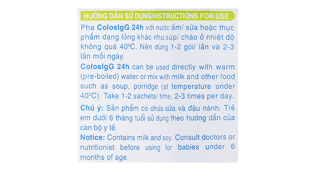 Pha ColoslgG 24h với nước ấm/sữa hoặc thực phẩm dạng lỏng khác như súp/cháo ở nhiệt độ không quá 40°C.