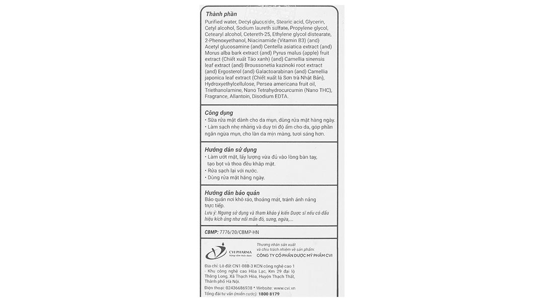 Purified water, Decyl glucoside, Stearic acid, Glycerin, Cetyl alcohol, Sodium laureth sulfate, Propylene glycol, Cetearyl alcohol, Cetereth-25, Ethylene glycol distearate, 2-Phenoxyethanol, Niacinamide (Vitamin B3) (and) Acetyl glucosamine (and) Centella asiatica extract (and) Morus alba bark extract (and) Pyrus malus (apple) fruit extract (Chiết xuất Táo xanh) (and) Camellia sinensis leaf extract (and) Broussonetia kazinoki root extract (and) Ergosterol (and) Galactoarabinan (and) Camellia japonica leaf extract (Chiết xuất lá Sơn trà Nhật Bản), Hydroxyethylcellulose, Persea americana fruit oil, Triethanolamine, Nano Tetrahydrocurcumin (Nano THC), Fragrance, Allantoin, Disodium EDTA.