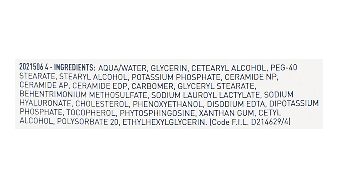 Aqua/Water/Eau, Glycerin, Cetearyl Alcohol, Peg-40 Stearate, Stearyl Alcohol, Potassium Phosphate, Ceramide NP, Ceramide AP, Ceramide EOP, Carbomer, Glyceryl Stearate, Behentrimonium Methosulfate, Sodium Lauroyl Lactylate, Sodium Hyaluronate, Cholesterol, Phenoxyethanol, Disodium EDTA, Dipotassium Phosphate, Tocopherol, Phytosphingosine, Xanthan Gum, Cetyl Alcohol, Polysorbate 20, Ethylhexylglycerin.