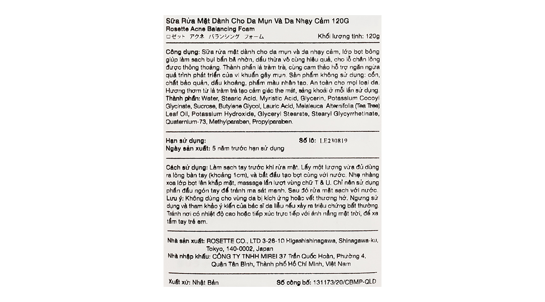 Sữa rửa mặt Rosette Acne Balancing Foam với thành phần chính là dầu lá trà giúp giúp hạn chế sự xâm nhập của vi khuẩn gây ra mụn, đồng thời cũng hỗ trợ cân bằng lượng dầu thừa, để da được sạch thoáng, mịn màng.