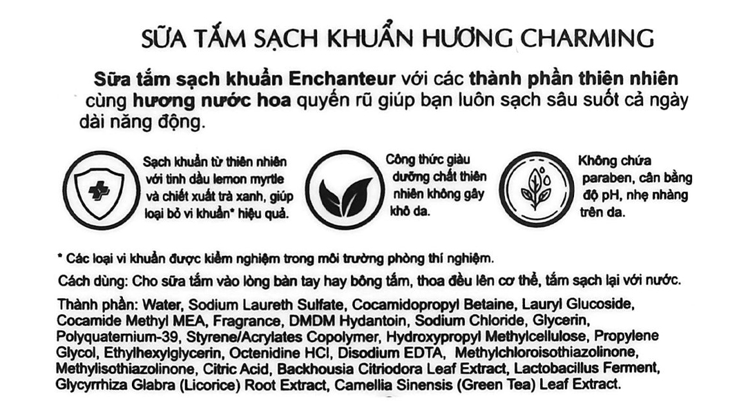 Thành phầnWater, Sodium Laureth Sulfate, Cocamidopropyl Betaine, Lauryl Glucoside, Fragance, Cocamide Methyl MEA, DMDM Hydantoin, Sodium Chloride, Glycerin, Polyquatemium-39, Styrên/Acrylates Copolymer, Hydroxypropyl Methylcellulose, Propylene Glycol, Ethylhexylglycerin, Octenidine HCI, Disodium EDTA, Methylchloroisothiazolinone, Methylisothiazolinone, Citric Acid, Backousia Citriodora Leaf Extract, Lactobacillus Ferment, Glycyrrhiza Glabra (Licorice) Root Extract, Camellia Sinensis (Green Tea) Leaf Extract.