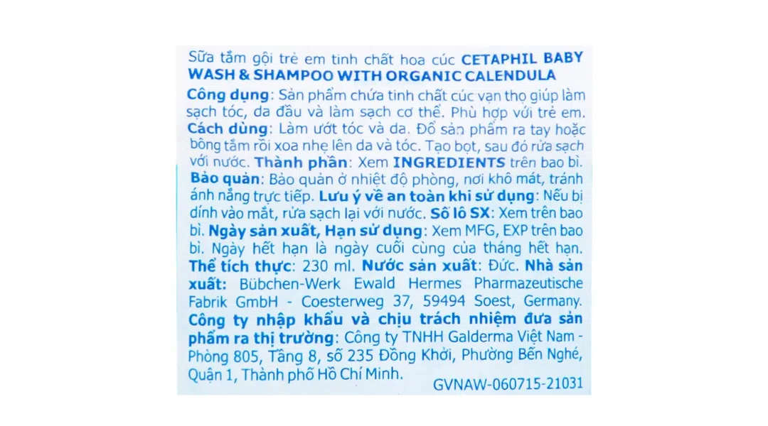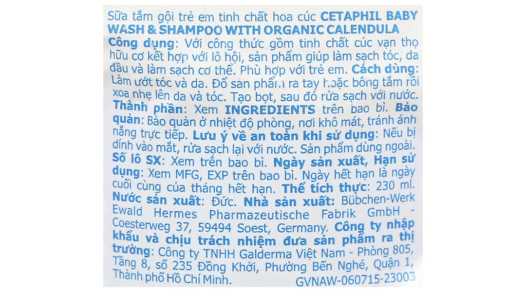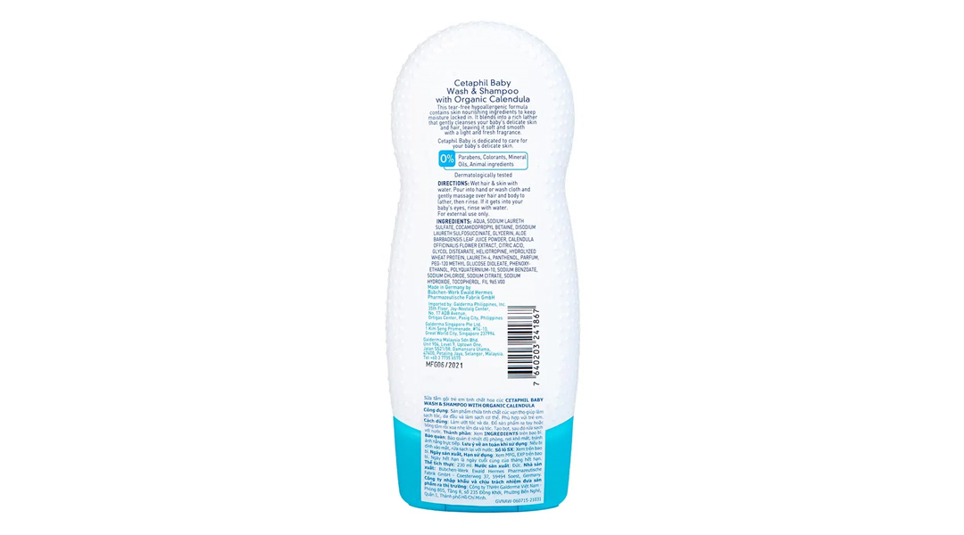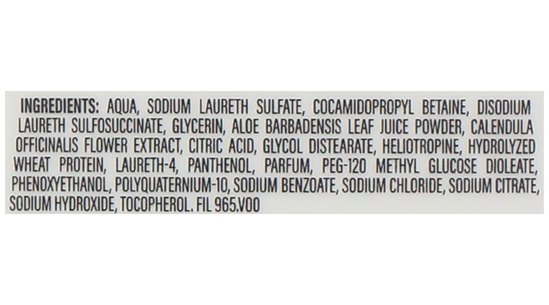 Thành phầnAqua, Sodium Laureth Sulfate, Cocamidopropyl Betaine, Disodium Laureth Sulfosuccinate, Glycerin, Aloe Barbadensis Leaf Juice Powder, Calendula Officinalis Flower Extract, Citric Acid, Glycol Distearate, Heliotropine, Hydrolyzed Wheat Protein, Laureth-4, Panthenol, Parfum, Peg-120 Methyl Glucose Dioleate Phenoxyethanol, Polyquaternium-10, Sodium Benzoate, Sodium Chloride, Sodium Citrate, Sodium Hydroxide, Tocopherol.