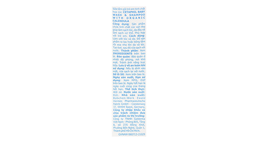 Sữa tắm gội cho bé Cetaphil được chiết xuất hoàn toàn từ hoa cúc hữu cơ, một thành phần tự nhiên nhẹ nhàng và dịu nhẹ, giúp làm sạch da và tóc của bé một cách nhẹ nhàng mà không gây kích ứng.