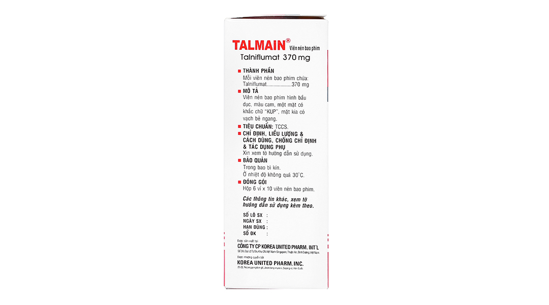 Viên nén bao phim hình bầu dục, màu cam, một mặt có khắc chữ “KUP”, mặt kia có vạch bẻ ngang.