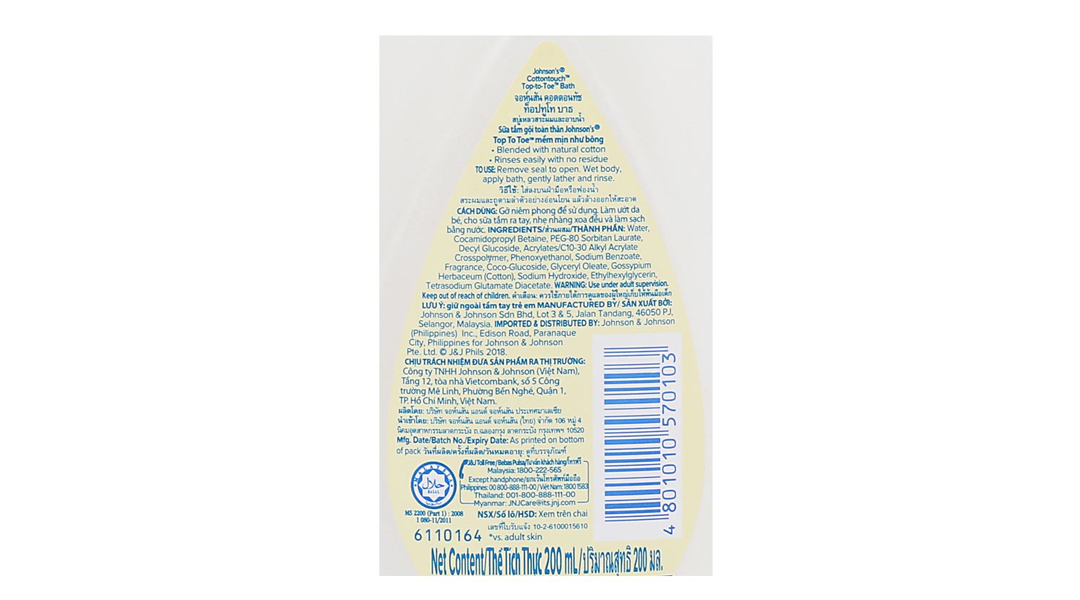 Dầu gội, sữa tắm cho bé Johnson & Johnson từ lâu đã là thương hiệu sản phẩm cho trẻ em cực kỳ an toàn, dịu nhẹ và phù hợp với làn da của bé. Sữa tắm gội toàn thân cho bé Johnson’s Baby 200ml với công thức chứa sợi bông 100% đến từ thiên nhiên cùng độ pH cân bằn nhẹ nhàng làm sạch làn da nhạy cảm của bé. Sản phẩm không gây cay mắt, cho bé làn da mềm mại mịn màng đồng thời lưu giữ hương thơm thư giãn dễ chịu.