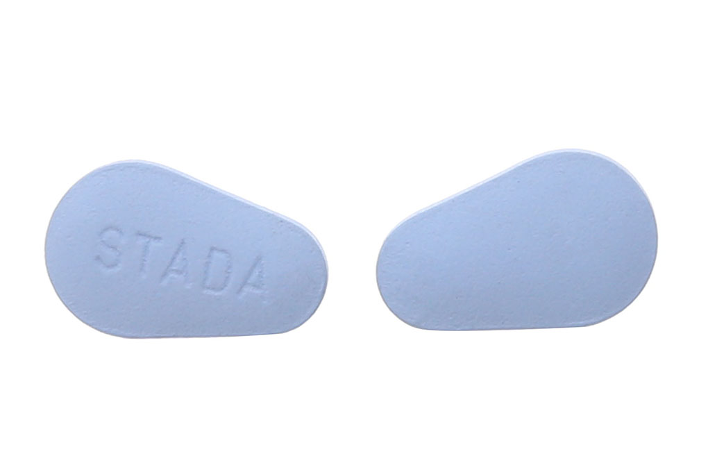 Viên nén hình giọt nước, bao phim màu xanh, một mặt có in chữ “STADA”, một mặt trơn.