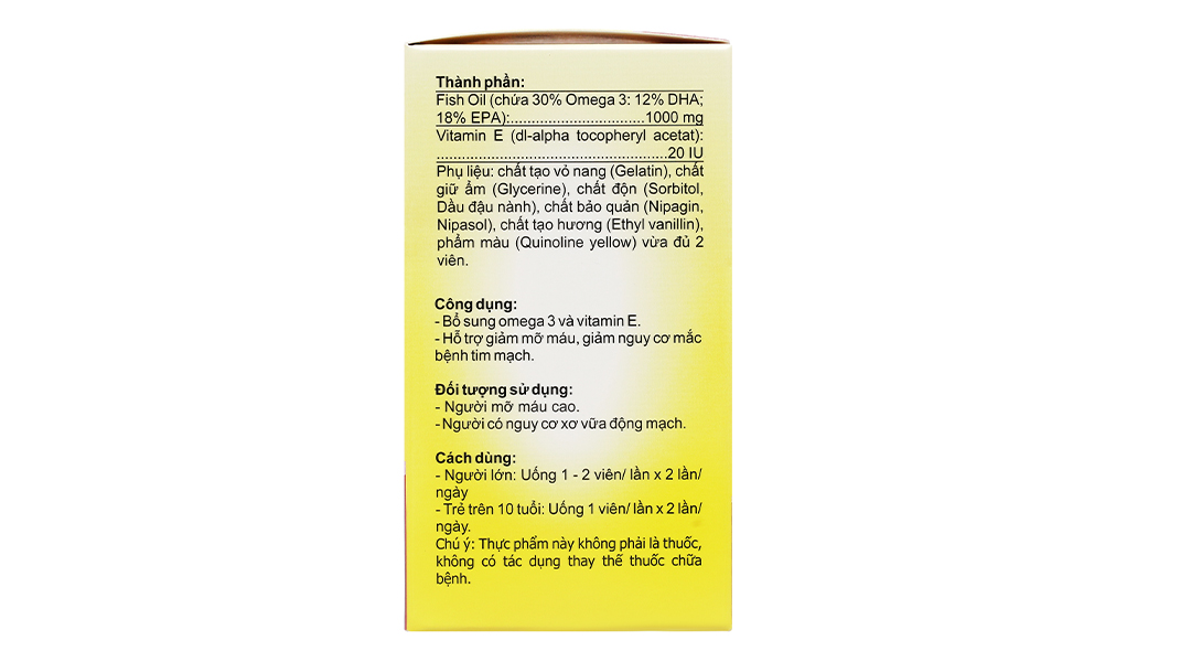 Hoạt chấtFish Oil (chứa 30% Omega 3: 12% DHA; 18% EPA), Vitamin E