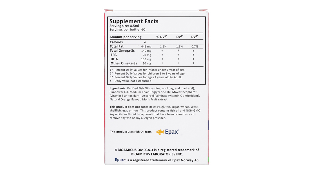 - BioAmicus Omega 3 có chứa dạng DHA siêu cô đặc, bổ sung từ 0,5ml BioAmicus Omega 3 mỗi ngày hỗ trợ trẻ phát triển toàn diện não bộ và thị lực, cho trẻ sáng mắt, thông minh, nhanh nhẹn.