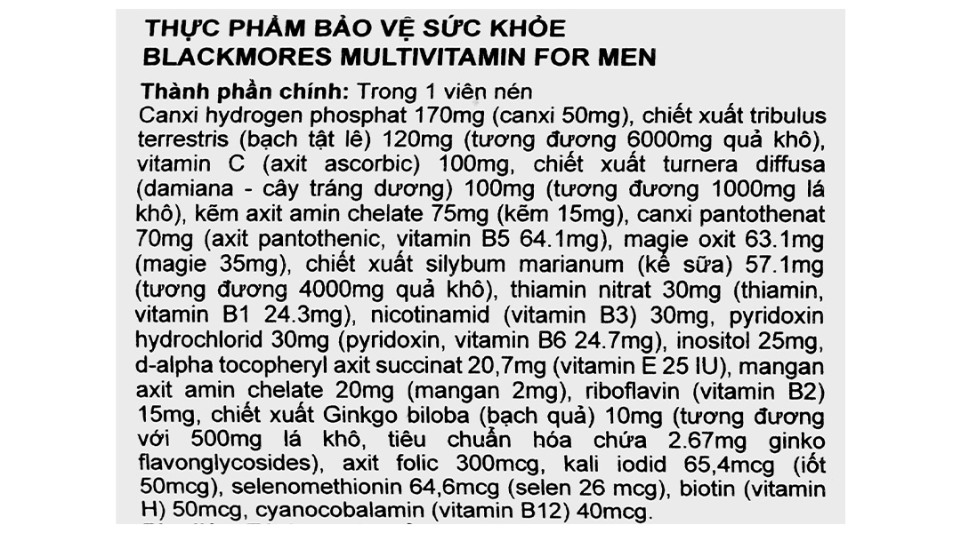 - Blackmores Multivitamin For Men là viên uống bổ sung vitamin tổng hợp cho nam giới được nhiều người trên thế giới lựa chọn sử dụng. Sản phẩm được nghiên cứu theo một công thức đặc biệt, bao gồm các dưỡng chất thiết yếu, phù hợp với người chăm tập luyện thể thao, người có chế độ ăn không đủ dưỡng chất.