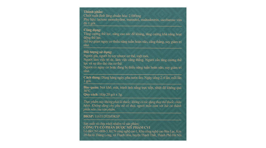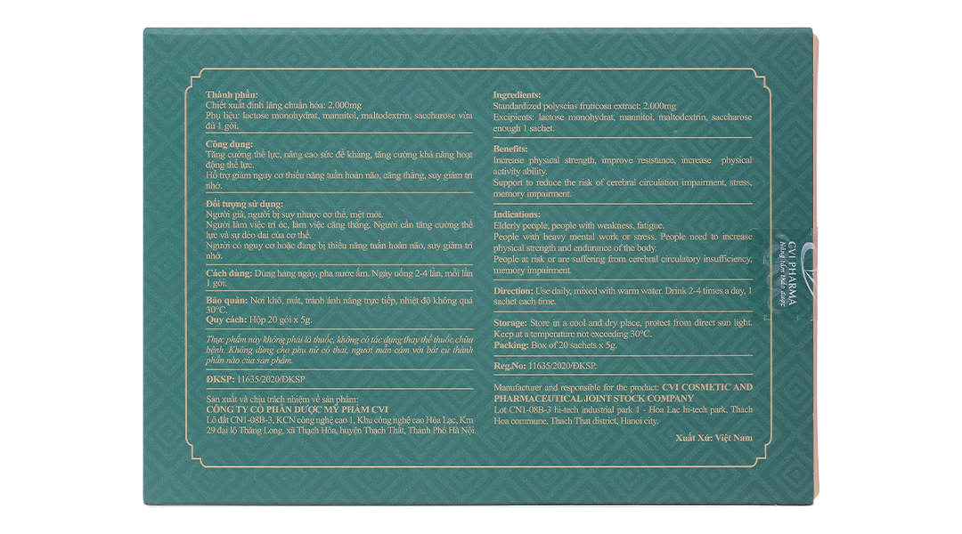 - Chiết xuất đinh lăng chuẩn hóa: 2.000mg.