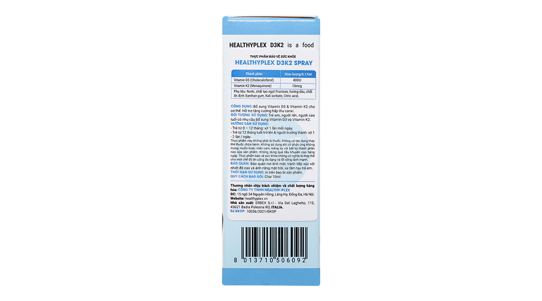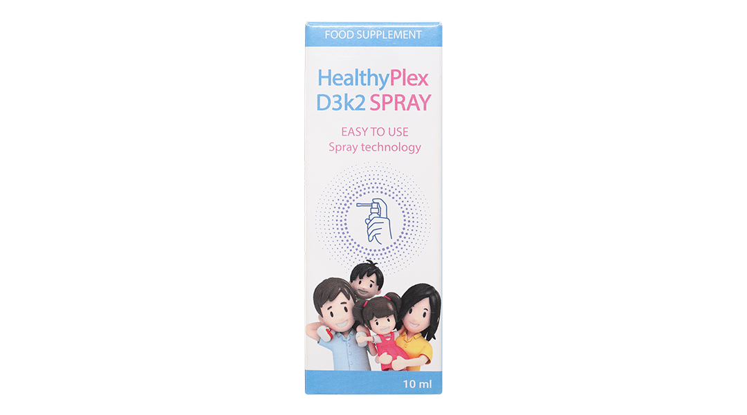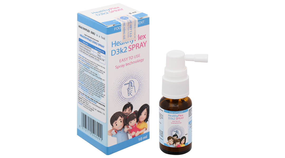 - Healthyplex D3K2 là sản phẩm bổ sung vitamin D3 và vitamin K2 dạng xịt, tiện dụng và dễ sử dụng, giúp cung cấp cho cơ thể những dưỡng chất quan trọng để duy trì sức khỏe xương. Mỗi lần xịt của HealthyPlex D3K2 Spray cung cấp 400 IU vitamin D3 và 10mcg vitamin K2, hỗ trợ tối đa trong việc hấp thu canxi và cải thiện sự chắc khỏe của xương.