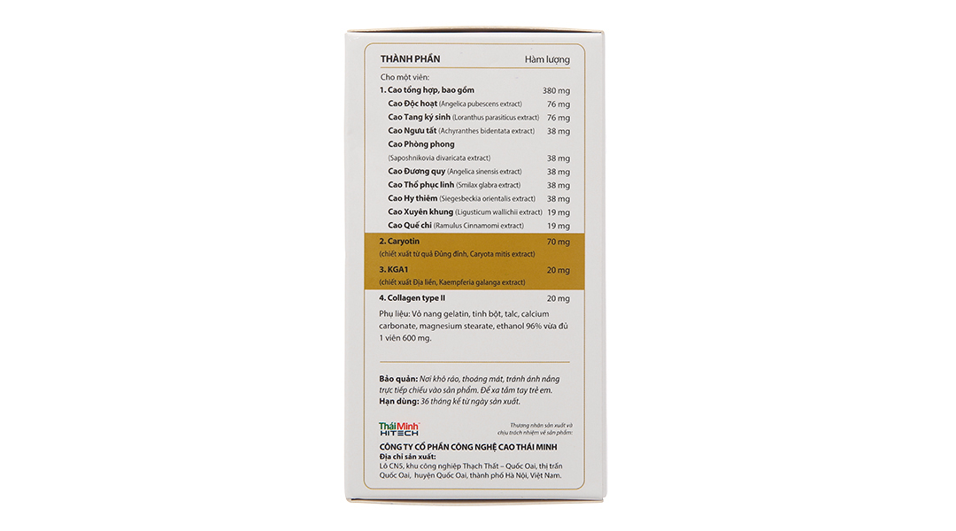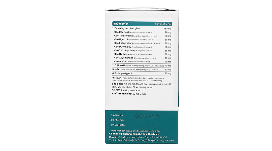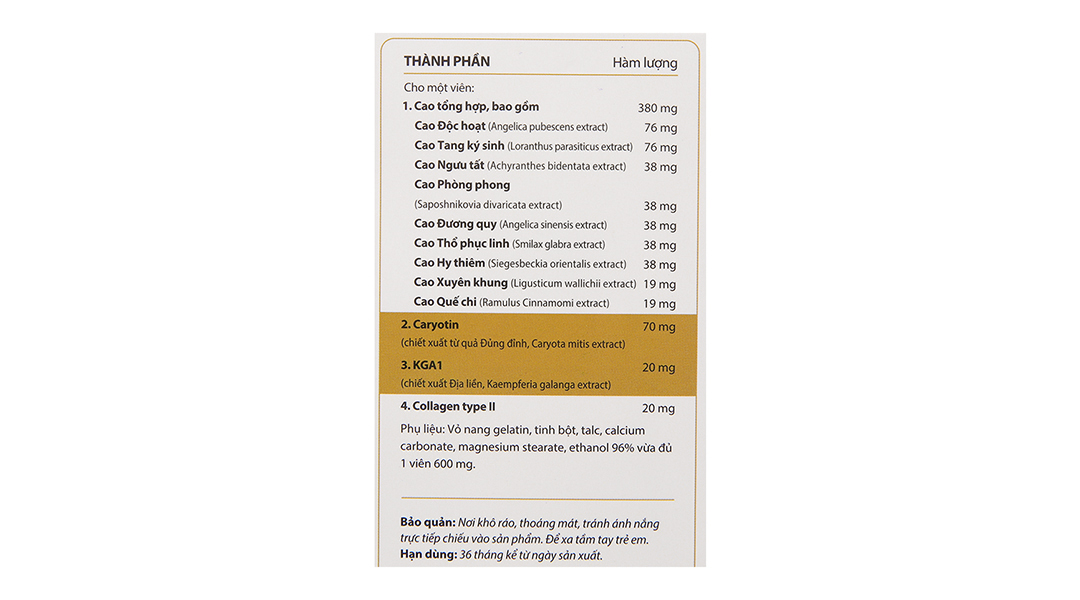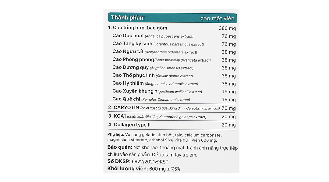 Hoạt chấtCao Xuyên khung, Cao Phòng phong, KGA1(chiết xuất Địa liền, Kaempferia galanga extract), Collagen type II, Cao Quế chi, Cao Độc hoạt, Cao Thổ phục linh, Cao Ngưu tất, Cao Hy thiêm, Cao Tang ký sinh, Cao Đương quy
