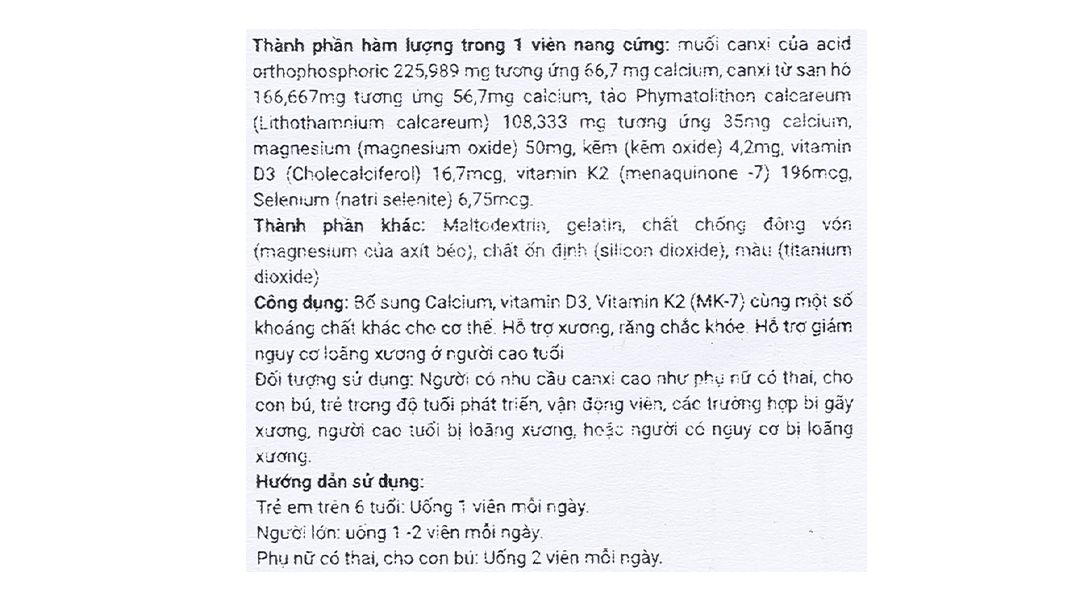 - Bổ sung Calcium, vitamin D3, Vitamin K2 (MK-7) cùng một số khoáng chất khác cho cơ thể.